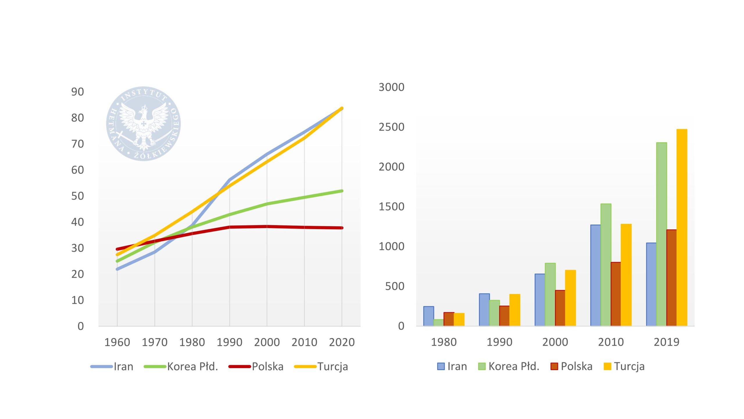 Tab. 1-2. Czynniki potęgotwórcze: ludność (mln) i PKB wg parytetu siły nabywczej (w mln dolarów międzynarodowych) na przykładzie Iranu, Korei Płd., Polski i Turcji. Opracowanie własne na podstawie danych www.populationof.net i MFW.